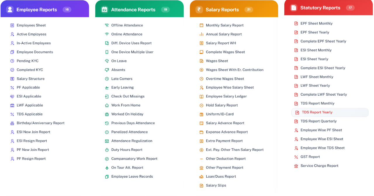 - Reports: Attendance, Leave, Payout, Salary Slips, Tour.